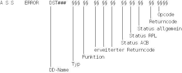 VSAM (Batch) Der Statuscode wird hexadezimal oder umgeschlüsselt jeweils in zwei Zeichen angezeigt. 'GE' Satz nicht gefunden oder Dateiende 'PM' doppelter Schlüssel (nur unter CICS) 'AM' Logischer Fehler 'HO' Programmfehler 'HX' Rollback nicht implementiert, Programmfehler 'NI' nicht eindeutige Abkürzung/Bezeichnung beim Arbeitsgebiet Im Batch werden die Fehler zusätzlich noch im JES-Protokoll genauer angelistet und zwar in der Form:DD-Name bezieht sich auf die fehlerhafte Datei (bei DST00A ist keine Datei betroffen). Die drei Stati ACB, RPL und allgemein geben programminterne Zustände wieder. Opcode ist die Aufrufart vom aufrufenden Programm und Returncode der an das aufrufende Programm zurückgegebene Returncode den dieses als Fehlercode anlistet. - Fehler mit logischen Zusammenhang A S S ERROR DST### 00 §§ 00 00 §§ §§ §§ AM §§§§ ! Fehlerspezifikation