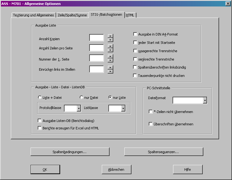 Im Einzelnen können folgende Visual-Basic-Funktionen zum Einstieg in die ST31.XLS verwendet werden: ->> Function AnwAusfuehren(AnwNr As Integer, Optional Passwort) Die Anwendung mit der Nummer AnwNr wird ausgeführt. Optional kann das Passwort Passwort mit übergeben werden. Es wird entweder True oder False zurückgegeben, abhängig davon, ob der Aufruf erfolgreich war oder nicht. Wenn AnwNr mit 0 besetzt ist, wird eine auf der Security-Datenbank zum jeweiligen Anwender hinterlegte Anwendung ausgeführt. (vgl. Handbuch ST09) ->> Function AnfAusfuehren(Bib As String, Anf As String, Opt.Passwort) Die Anforderung Anf aus der Bibliothek Bib wird ausgeführt. Optional kann das Passwort Passwort mit übergeben werden. Es wird True oder False zurückgegeben, abhängig davon, ob der Aufruf erfolgreich war oder nicht. ->> Function MehrfachAusfuehren(Anf1 as string, Anf2 as string, Optional Anf3, Optional passwort) as boolean Mit dem Aufruf dieser Routine kann man sich das Auswertungsergebnis von bis zu drei Anforderungen untereinander auf ein Excel-Blatt ausgeben lassen. Die Parameter Anf1, Anf2 und Anf3 bezeichnen die Anforderungsnamen, denen wahlweise die Bibliothek mit einem Doppelpunkt vorangestellt werden kann. Wird keine Bibliothek angegeben, so wird die entsprechende Anforderung aus der Bibliothek 'B' ausgeführt. Beispiel: MehrfachAnfAusfuehren "ANF00001", "P:ANF00010", "E:STAT9999" Rückgabeparameter: True oder False ->> Function Bericht_anzeigen(Anf as string, Optional Passwort) Es wird von der Berichtsdatenbank das Element mit dem Namen Anf eingelesen und angezeigt. Wenn es mehrere Berichte mit diesem Namen gibt, wird der zuletzt erstellte berücksichtigt. ->> Function Bib_Inhalt_Zeigen(Bib as string, Optional Passwort) Mit dieser Funktion wird eine Excel-Datei erstellt, die eine Liste aller Elemente der Bibliothek Bib enthält. Die Datei hat den Namen Bib_A.xls, Bib_B.xls, etc. und befindet sich im Dateien-Verzeichnis. Optional kann das Passwort mitgegeben werden. In den einzelnen Spalten steht dabei folgendes: A Anforderungsname + Kommentar B-J weitere Kommentare K Turnuskennzeichen bei periodisch auszuführenden Anforderungen L Datum der nächsten Ausführung (Batch) M Datum der letzten Ausführung (Batch) bzw. Anwendungsnummer N Erstellungsdatum Es wird True oder False zurückgegeben, abhängig davon, ob die Operation erfolgreich ausgeführt wurde. ->> Sub ASSEnde() ASS wird beendet. Diese Funktion kann z.B. in der auto_close Prozedur der Einstiegsmappe aufgerufen werden. ->> Sub OptExcelBeenden(w As Boolean) Mit dieser Funktion steuern Sie, ob Excel beendet werden soll, wenn ASS beendet wird. Wenn dies der Fall sein soll, so ist für w true einzusetzen. Der Fall w = FALSE ist die Standardeinstellung. ->> Function Set_Parameter_von_aussen (Anzahl As Int., ARRAY(A,B,C)) Wenn diese Funktion gerufen wird, wird beim Ausführen einer Anwendung oder Anforderung nicht die Parametermaske aufgerufen, sondern es werden die beim Set_Parameter_von_aussen- Aufruf mitgegebenen Parameter verwendet. Der Aufbau der mitgegebenen Parameter ist wie folgt: Der erste Parameter bezeichnet als Integer die Anzahl der Parameter, die gesetzt werden sollen. Es müssen nicht alle Parameter einer Anforderung übergeben werden. Im folgenden Datenfeld müssen je Parameter immer 3 Werte in der folgenden Reihenfolge übergeben werden: 1. Parametername: &&........ 2. Parameterinhalt: Der Aufrufer ist für die Richtigkeit verantwortlich . 3. Schlüsselnummer: Wenn keine Schlüsselnummer erforderlich ist, Null anliefern. Es sind maximal 10 Parameter möglich, das Array darf also maximal 30 Einträge enthalten. Geprüft wird lediglich, ob mindestens 1 und höchstens 10 im Feld 'Anzahl' steht und ob das Datenfeld die richtige Anzahl Parameter enthält. Die Parameter sind nur für eine einmalige Ausführung gültig. Ist etwas anderes gewünscht, muss der Set_Parameter_von_aussen-Aufruf entsprechend wiederholt werden. BEISPIEL: Im Folgenden ist ein Beispiel für einen Aufruf der obigen Funktion aus einem Visual-Basic-Modul angegeben: If Set_Parameter_von_aussen( 2, _ Array("&&WE", "PROVIS", "0", "&&ZT", "0701", "0")) Then _ Anfausfuehren "B", "ANF00001" Die Variable 'Anzahl' (im Beispiel '2' ) muss ohne Hochkomma angegeben werden, weil sie vom Typ Integer ist. Die Anweisung 'Array' generiert ein Datenfeld mit so vielen Elementen, wie in der Klammer zwischen den Hochkommas angegeben sind. Da es sich um Zeichenfolgen handelt, sind Hochkommas zu verwenden. Bei diesem Aufruf muss zu Beginn des Moduls 'Option Base 1' angegeben werden, andernfalls ist am Beginn des Arrays ein Dummyelement einzufügen. Rückgabeparameter: Boolean (True(-1) oder False(0)) ->> Function Bibliothek_setzen(Wert As String) Wenn diese Funktion gerufen wird, wird die Voreinstellung der Listbox für die Bibliotheken in der Anforderungsübersicht auf 'Wert' gesetzt. Rückgabeparameter: True oder False Durch Anpassung der Startmappe ST31STA.XLS kann diese Funktion aufgerufen werden: - Aufruf der Funktion innerhalb der Funktion Vorstart im Modul 'User'. - Setzen des Parameters in der Call-Anweisung entsprechend dem folgenden Beispiel auf den gewünschen Wert: CALL Application.Run("ST31VB97.XLA!Bibliothek_setzen", "A") ->> Function Opt_Anforderungen_sofort(w as boolean, Optional Filter) Bei Aufruf dieser Funktion mit w = True werden in der Bibliotheks- übersicht sofort die vorhandenen Anforderungen angezeigt, der Anwender muss also nicht erst 'Anzeigen' betätigen. Dabei kann auch ein Filter zur Einschränkung der Elemente mitgegeben werden. ->> Function Opt_mit_Verzeichnis_starten(w As Boolean) Bei Aufruf dieser Funktion mit w = True ist beim ersten Aufruf der Bibliotheksübersicht das Register 'Verzeichnisse' aktiviert. ->> Function Listenfeld_Grenzwert_setzen(Wert As Integer) Beim Aufruf dieser Funktion wird die Voreinstellung der Anzahl von Zeilen, die mit einem Aufruf in die Listboxen für die Schlüsselinhalte gelesen werden, auf 'Wert' gesetzt. Rüc