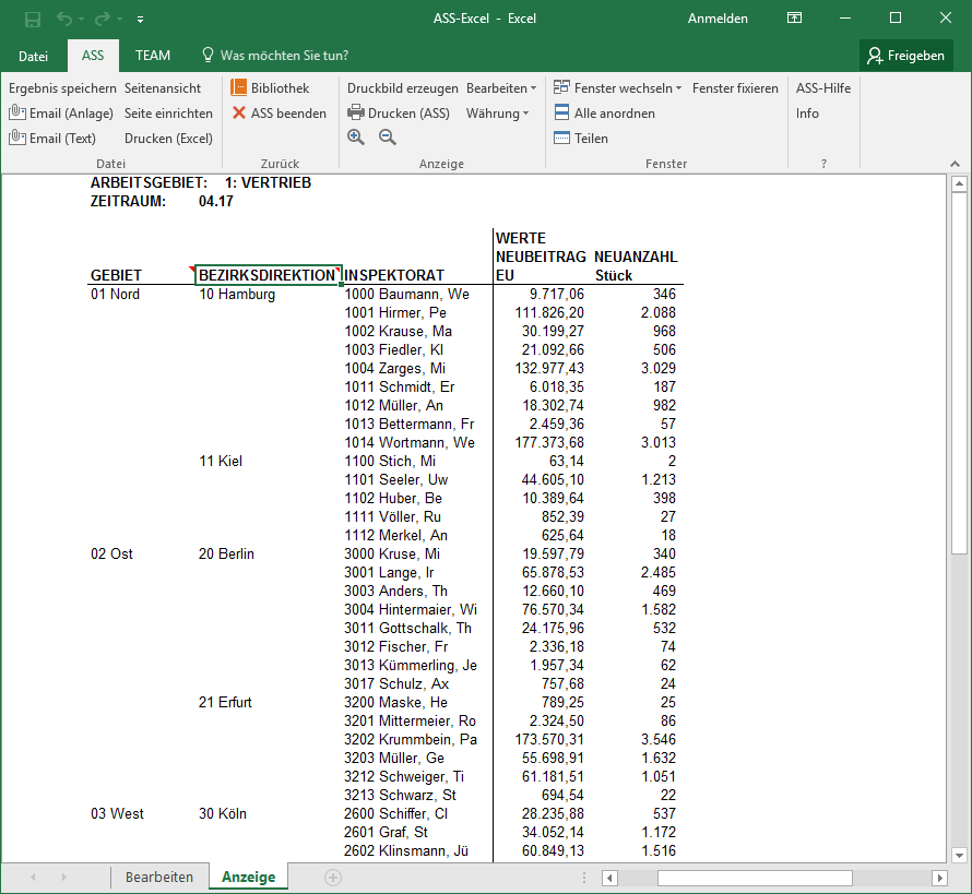 Die Hauptaufgabe von ASS als Statistiksystem und DataWareHouse besteht darin, die für das Controlling eines Unternehmens relevanten Daten zu verwalten und für Statistikanfragen bereitzuhalten. Diese Aufgabe wird bewerkstelligt, indem die gewünschten Daten in periodischen Abständen (täglich, wöchentlich, monatlich, ...) in die ASS-eigene Datenhaltung eingespeichert werden. Dabei werden die Daten schon im Vorfeld nach fachlichen Kriterien in sogenannte Arbeitsgebiete aufgeteilt. So kann es beispielsweise ein Bestandsarbeitsgebiet geben, das Auskunft über die zu einem bestimmten Zeitpunkt in einem Versicherungsunternehmen bestehenden Versicherungsverträge gibt. Daneben kann es ein Vertriebsarbeitsgebiet geben, in dem die von den einzelnen Versicherungsvertretern im jeweiligen Zeitraum abgeschlossenen Verträge erfasst sind. Trotz der fachlichen Trennung der Daten ist es aber möglich, statistische Abfragen über mehrere Arbeitsgebiete hinweg zu erstellen. Ein Arbeitsgebiet enthält im allgemeinen mehrere Schlüssel, Werte und Zeiträume. Unter diesen Begriffen versteht man im ASS folgendes: Schlüssel Aufteilung der Daten nach qualitativen Merkmalen (z.B. Vertreternummer, Sparte, etc.). Ein Schlüssel hat im allgemeinen mehrere Ausprägungen oder Schlüsselinhalte. So könnten beispielsweise die Nummern 1004711, 12340815, ... Ausprägungen des Schlüssels Vertreternummer sein. Mögliche Inhalte des Schlüssels Sparte sind RECHT, LEBEN, UNFALL, .... Eine Schlüsselausprägung hat eine für den Schlüssel festgelegte Anzahl von Zeichen (max. 50). So ist im obigen Beispiel in der Schlüsseldatenbank von ASS für den Schlüssel Vertreternummer eine Länge von 7 Zeichen vorgesehen worden. Zu den eigentlichen Ausprägungen können im ASS noch erläuternde Texte in Form einer Bezeichnung (max. 20 Zeichen) und einer Abkürzung (max. 6 Zeichen) abgelegt werden. Die Bezeichnung zur Vertreternummer 1004711 könnte beispielsweise den Namen des zugehörigen Vertreters enthalten. Werte Die Werte eines Arbeitsgebietes enthalten die Zahlen, die für das betreffende Unternehmen in diesem Zusammenhang interessant sind. Mögliche Werte sind also NEUANZAHL, NEUBEITRAG, etc. Werte können mit Eigenschaften versehen werden (Stellenzahl, Nachkommastellen, Dimension etc.). Zeitraum Pro Arbeitsgebiet wird festgelegt, ob die Daten auf Monatsebene (Monats-Arbeitsgebiet) oder auf Tagesebene (Tages-Arbeitsgebiet) kumuliert eingespeichert werden. Mit einer Zeitraumangabe legen Sie in einer Statistikanfrage fest, für welche(n) Monat(e) bzw. Tag(e) Sie die gewünschte Informationen gezeigt bekommen möchten. Umgekehrt erhalten Sie an verschiedenen Stellen des Auswertungsdialoges Auskunft über die zur Verfügung stehenden Zeiträume. Die Begriffe WERTE und ZEITRAUM werden in manchen ASS- Handbüchern auch als Pseudoschlüssel bezeichnet. Genaueres über die technischen Hintergründe der ASS- Datenhaltung entnehmen Sie bitte der Systemdokumentation und den Betriebshandbüchern. Die qualitativen Gesichtspunkte (Schlüssel), für die die Werte gezeigt werden, müssen innerhalb einer Anforderung festgelegt werden. Darüber hinaus kann mit einer Reihe von Darstellungsoptionen (Sortierung, (Zwischen-) Summenbildung, ...) die Statistik detailliert gestaltet werden. Ziel dieses Handbuches ist, Ihnen die Grundlagen der Anforderungserstellung unter der ASS-EXCEL- Oberfläche zu vermitteln.