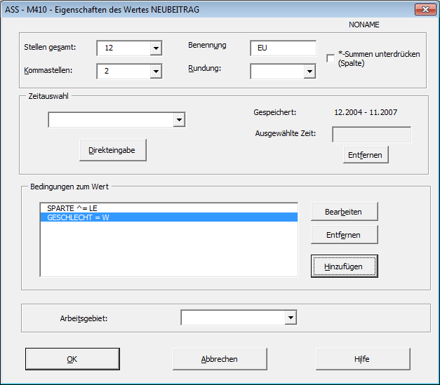 Die Werte eines Arbeitsgebietes enthalten die Zahlen, die für das betreffende Unternehmen in diesem Zusammenhang interessant sind. Mögliche Werte sind also NEUANZAHL, NEUBEITRAG, etc. Werte können mit Eigenschaften versehen werden (Stellenzahl, Nachkommastellen, Dimension etc.).