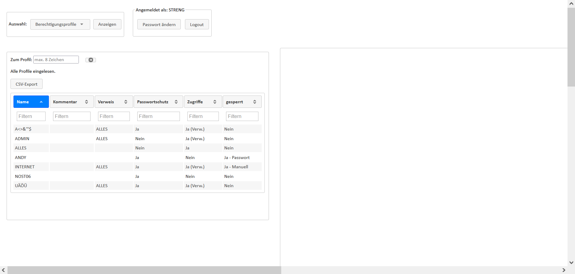Die Elementeübersicht stellt die Elemente des ausgewählten Dropdown-Menü-Punktes tabellarisch dar. Beispielhaft sind im obrigen Bild Berechtigungsprofile dargestellt. Will man in ein einzelnes Element verzweigen, so hat man dazu drei Möglichkeiten. Steht das gewünschte Element als Eintrag in der Übersichtstabelle, so kann man die Zeile des Eintrags Doppelklicken. Steht es nicht in der Übersichtstabelle, kann dies zwei Gründe besitzen. Entweder ist das Element noch nicht angelegt oder das Element befindet sich außerhalb des angezeigten Bereichs. Im zweiten Fall lässt sich entweder über das 'Einlesen ab'-Eingabefeld ein anderer Bereich einlesen, oder durch Bereichsvergrößerung eine Änderung der angezeigten Elemente erzielen. Die Anzahl der angezeigten Elemente kann auf der Textdatenbank im Text 'D A 113' unter dem Eintrag 'WST09-Grenzwert' angepasst werden. Das 'Einlesen ab'-Eingabefeld wird dabei ausgeblendet (siehe obiges Bild), wenn alle Elemente eingelesen werden konnten. In beiden Fällen kann man durch Eingabe des Elementnamens im oberen Eingabefeld (neben 'Zum Profil' im Bild) und entweder durch Betätigen der 'ENTER'-Taste oder durch Drücken des Pfeil-Buttons das Öffnen des einzelnen Elements veranlassen. Durch Drücken des 'CSV-EXPORT'-Buttons wird eine Repräsentation des Tabelleninhalts als CSV-Datei generiert und kann so gespeichert werden. Durch Klicken einer Überschriftszeile der Tabelle (im Bild 'Name', 'Kommentar' etc.) kann die Tabelle auf- bzw. absteigend sortiert werden. Hält man während des Klickens die 'Shift'-Taste gedrückt, löst sich die Sortierung wieder auf. Eine Eingabe in den Eingabefeldern unterhalb der Überschriftszeilen bewirkt ein Filtern der Tabelleninhalte.